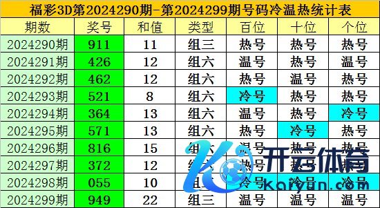 上期总结:福彩3D第2024299期开奖奖号为:949,奖号类型为:组三体育集锦,奖号冷温热态为:温号+温号+温号。
