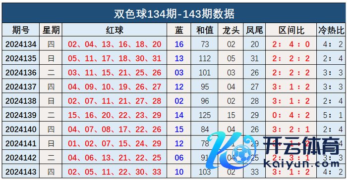 双色球第2024143开奖奖号:红球02、05、11、22、30、33,蓝球10。和值103,龙头02,凤尾33,区间比3:1:2,冷热比4:2。蓝球开出大数号码10。