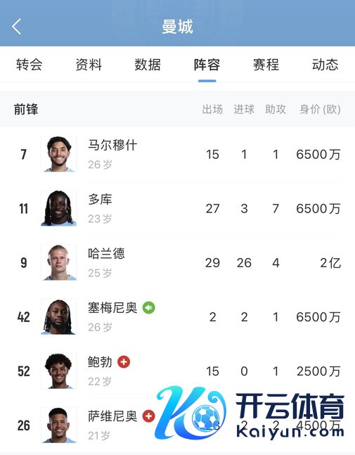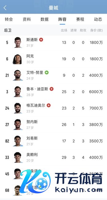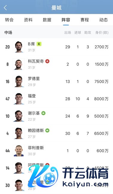 现在曼城前卫、中场、后卫、门将球员共有7东说念主年齿在30岁及以上,为B席、科瓦契奇、菲利普斯、斯通斯、阿克、贝蒂内利和奥尔特加,曼城队内大无数齐是当打之年的球员。