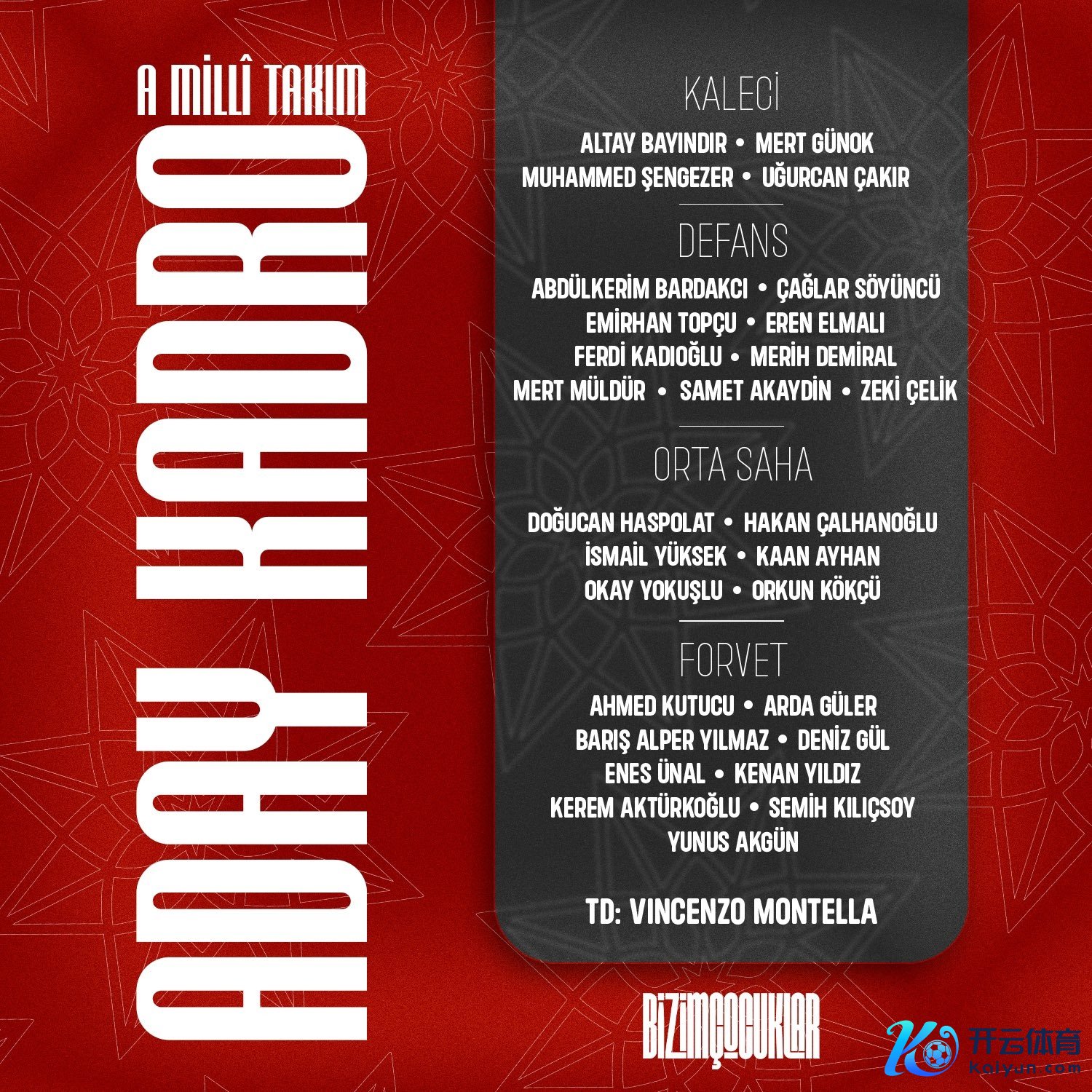 11月9日讯 土耳其队公布本月欧国联名单,恰尔汗奥卢领衔,居勒尔、伊尔迪兹、科克库在列,球队将在欧国联B联赛先后对阵威尔士和黑山。