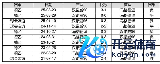 马格德堡 VS 汉诺威96两队近10年的交战次数为10场,马格德堡3胜2平5负,赢球概率为30.0%,平局概率为20.0%,输球概率为50.0%。