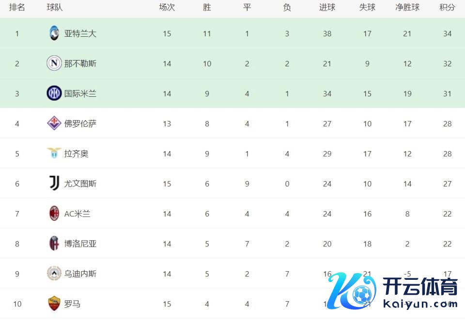 在积分榜上,亚特兰大以34分领跑,那不勒斯紧随后来,拿到了32分。国外米兰以31分排行第三,前三名的差距绝顶小,竞争格外浓烈。佛罗伦萨和拉皆奥分袂以28分排行第四和第五。尤文图斯诚然是惟一不败的球队,但过多的平局让他们只不祥排行第六。AC米兰以22分排行第七,而赢球后的罗马总积分达到16分,升至第十名。