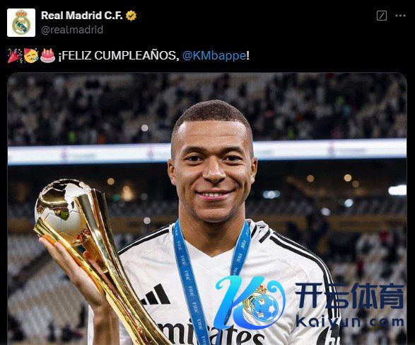 皇马官方晒出了一张姆巴佩捧着洲际杯冠军奖杯的相片,并奉上了寿辰欢欣的祈福。